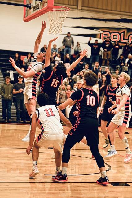 LARIMORE, N.D. – Trailing by a point with 49 seconds left in the fourth quarter, Larimore junior guard Baron Burns calmly went to the free throw line and made a basket to tie the game, leading to the Larimore Polar Bears upset over Midway/Minto Mustangs, 67-64, in a district varsity boys basketball game on Friday, Jan. 16.