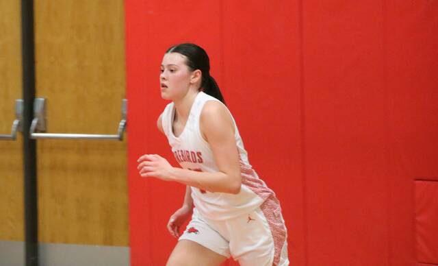 Devils Lake’s Mia Elsperger runs down the court during the Firebirds’ region win over May-Port-C-G. (Photo by Mojo Hill)