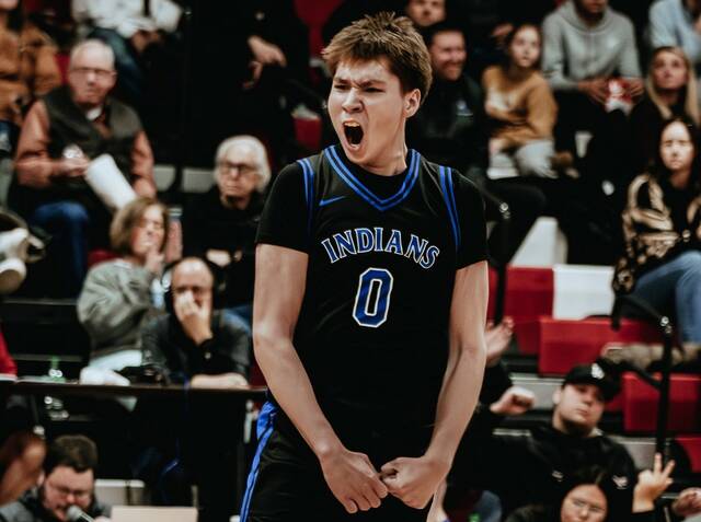 Four Winds/Minnewaukan’s Joran Lohnes celebrates during the Indians’ win over Kindred on Saturday in the DLYA Shootout. (Photo by Cameron Carlson)
