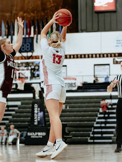 Tylie Brodina extends her arms for a pass in Devils Lake’s seventh-place game against Watford City. (Photo by Cameron Carlson)