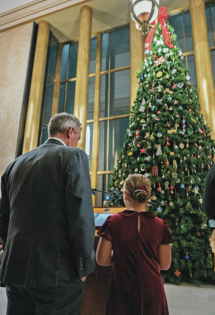 Just prior to the tree lighting, a group of girls varying in age level from toddler to teen approached the tree, each to hang their own handmade ornaments, followed by a special guest. Gov. Armstrong’s mother Connie presented a handmade cross-stitched ornament from the governor’s childhood for the tree, which she and her son hung together.