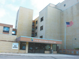 Friends, family and members of the Devils Lake Chamber of Commerce stand witness on Friday afternoon, Dec. 5 as Lauren Gratton cuts the ribbon in front of her new floral shop Harvested Blooms, flanked by husband and co-owner Kyle Gratton (left) and Mayor Jim Moe (right). (Photo by Mark C. Robinson)