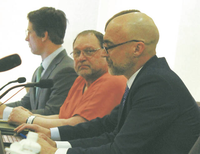 Werner Kunkel at his Jan. 7 evidentiary hearing for a new trial at the Ramsey County Courthouse, seen here seated between (left to right) attorneys Bruce Ringstrom Jr. and James Mayer. His 1995 conviction of the murder of Gilbert Fassett in 1986 was overturned on March 2 by Judge Daniel Narum. (Photo by Louise Oleson)