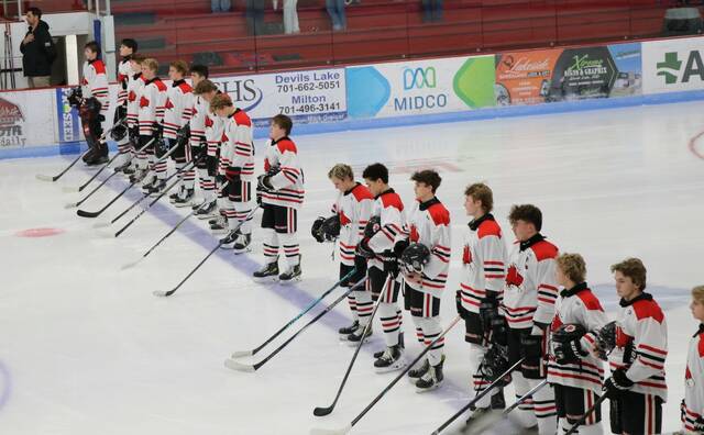 The Devils Lake boys’ hockey team stands for the national anthem in a game at Burdick Arena earlier this season. (Photo by Mojo Hill)