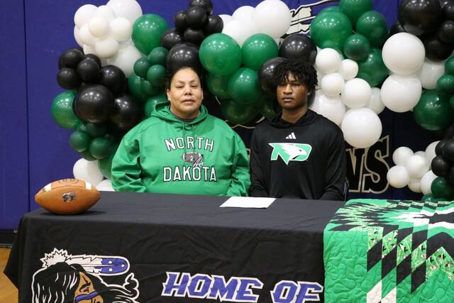The Four Winds senior, a native of Tokio, N.D., finalized his signing with the UND football program Wednesday. He posed for pictures alongside friends, family and coaches in his home gym.