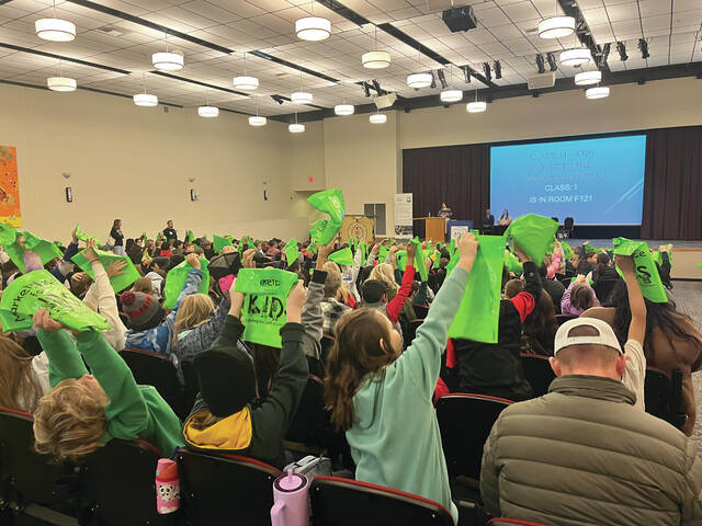 McDonald then instructed the students to hold up their green bags and to make sure to fill out their report cards. And then invited them all, including volunteers and teachers, to enjoy their classes and projects and explore.